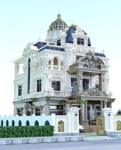 Biệt thự kiểu lâu đài 3 tầng được tọa lạc trên một khu đất rộng, các kiến trúc sư Trịnh Gia đã thiết kế khoa học kết hợp với không gian cây xanh thoáng mát phù hợp với công năng sử dụng của tùy từng chủ đầu tư. Toàn bộ lâu đài dinh thự là một cung điện nguy nga lộng lẫy, nhìn là đã yêu thích. Được sử dụng hai gam mù chủ đạo là màu trắng và vàng sữa, kết hợp với mái mansard xanh, mái vòm xanh tạo sự năng động, bề thế cho tổng thể ngôi nhà. Không những vậy chúng ta còn bị thu hút bởi những khối hệ thống hoa văn to, cầu kì, tinh tế.